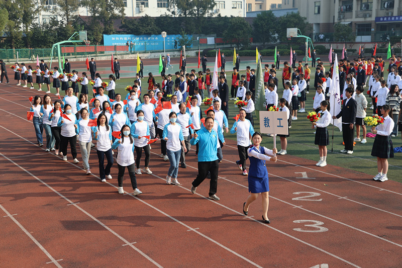 在激昂的運動員進行曲中,師生代表擺著整齊的方陣,邁著矯健的步伐,依次通過主席臺,逐一亮相。各方陣帶著精心準備的節(jié)目,他們的表演獨具匠心,他們的口號激揚振奮,他們的誓言鏗鏘有力,在主席臺前一展才藝和創(chuàng)意。