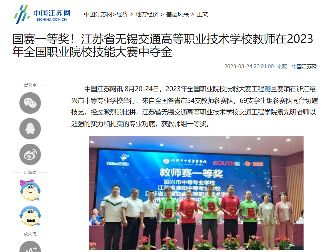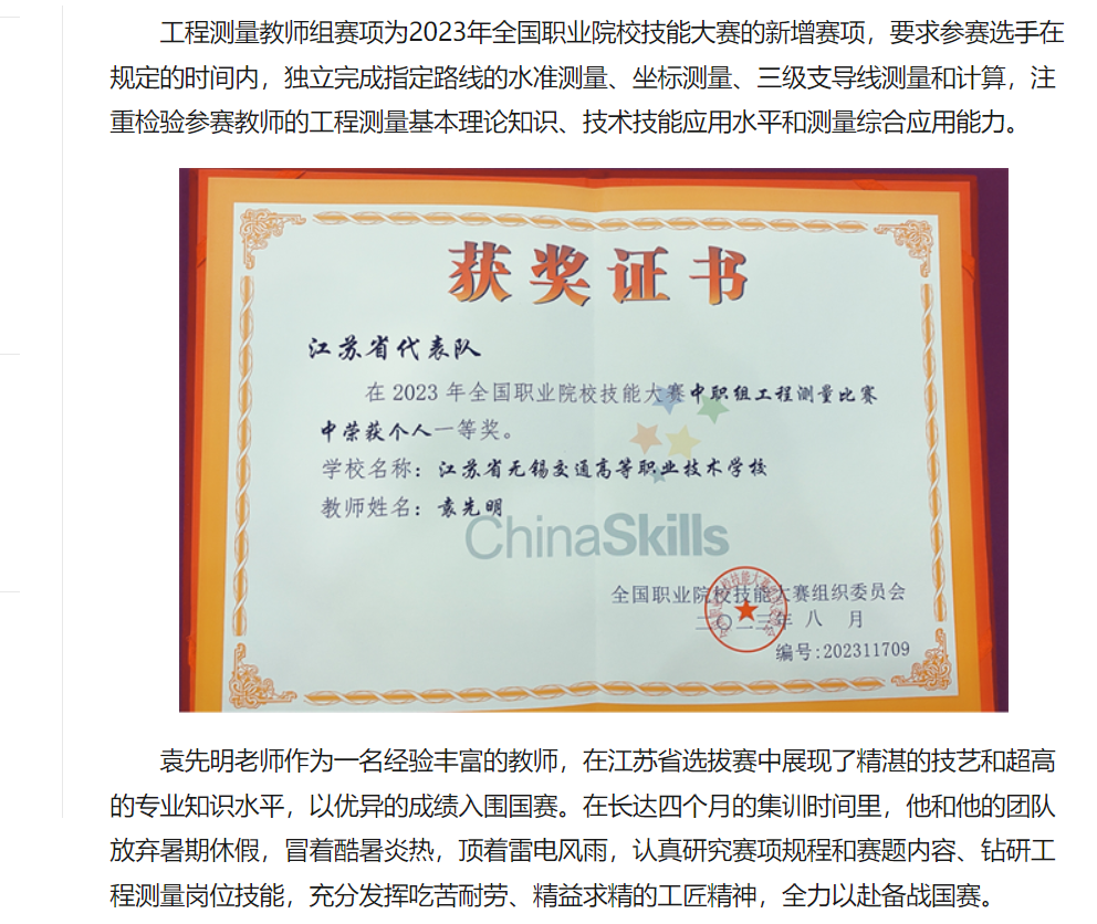 江蘇交通:無錫交校教師獲全國(guó)職業(yè)院校技能大賽工程測(cè)量賽項(xiàng)一等獎(jiǎng)