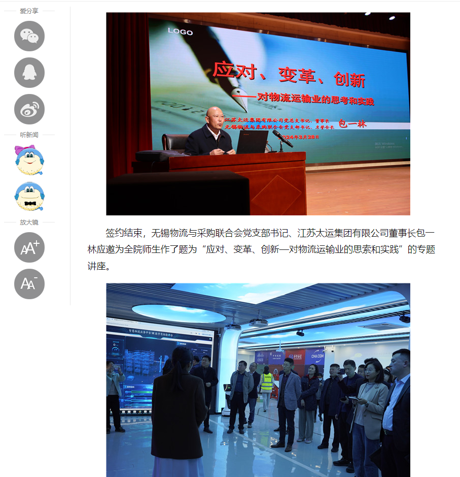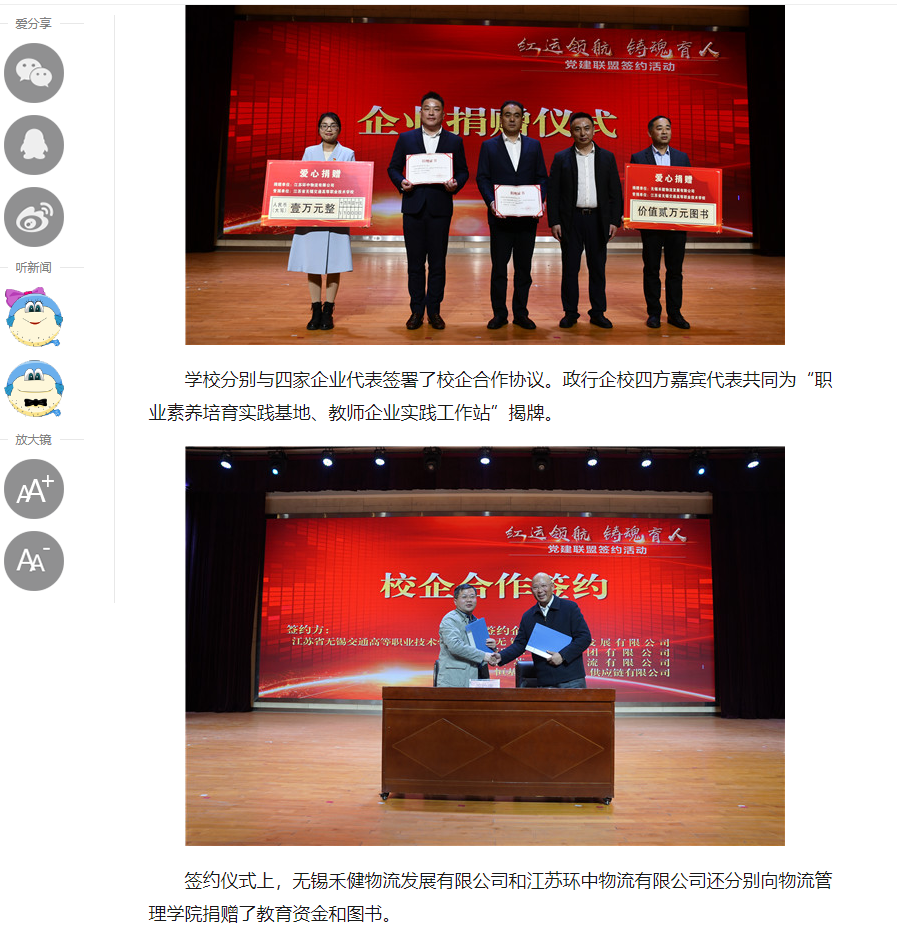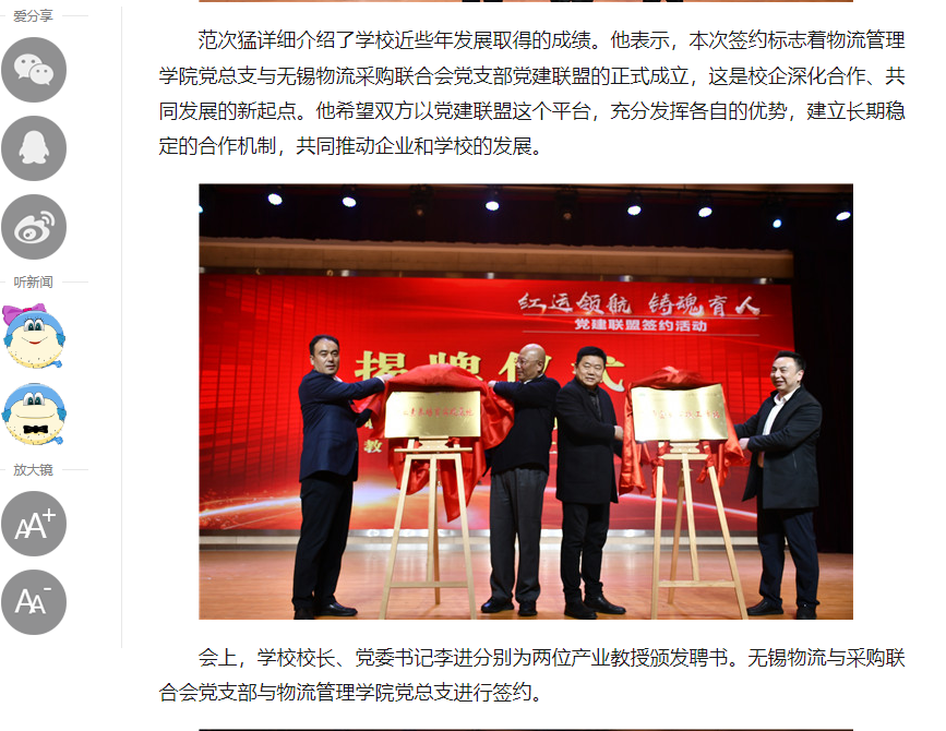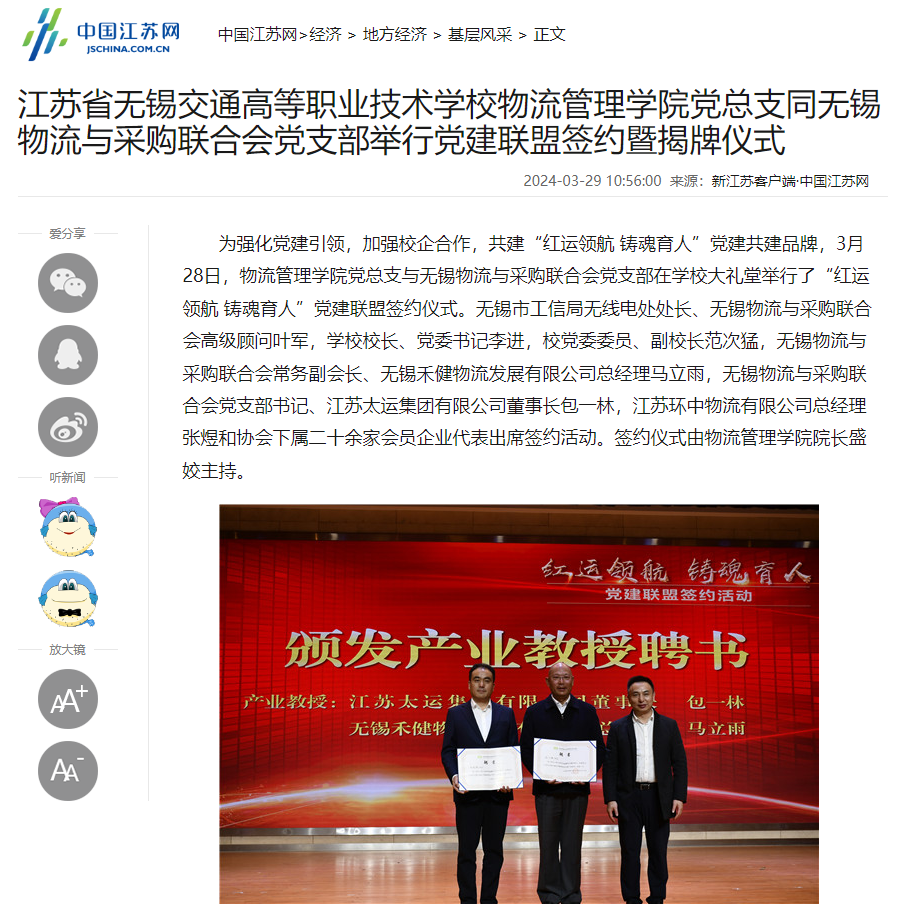 中江網(wǎng):江蘇省無錫交通高等職業(yè)技術(shù)學(xué)校物流管理學(xué)院黨總支同無錫物流與采購聯(lián)合會黨支部舉行黨建聯(lián)盟簽約暨揭牌儀式