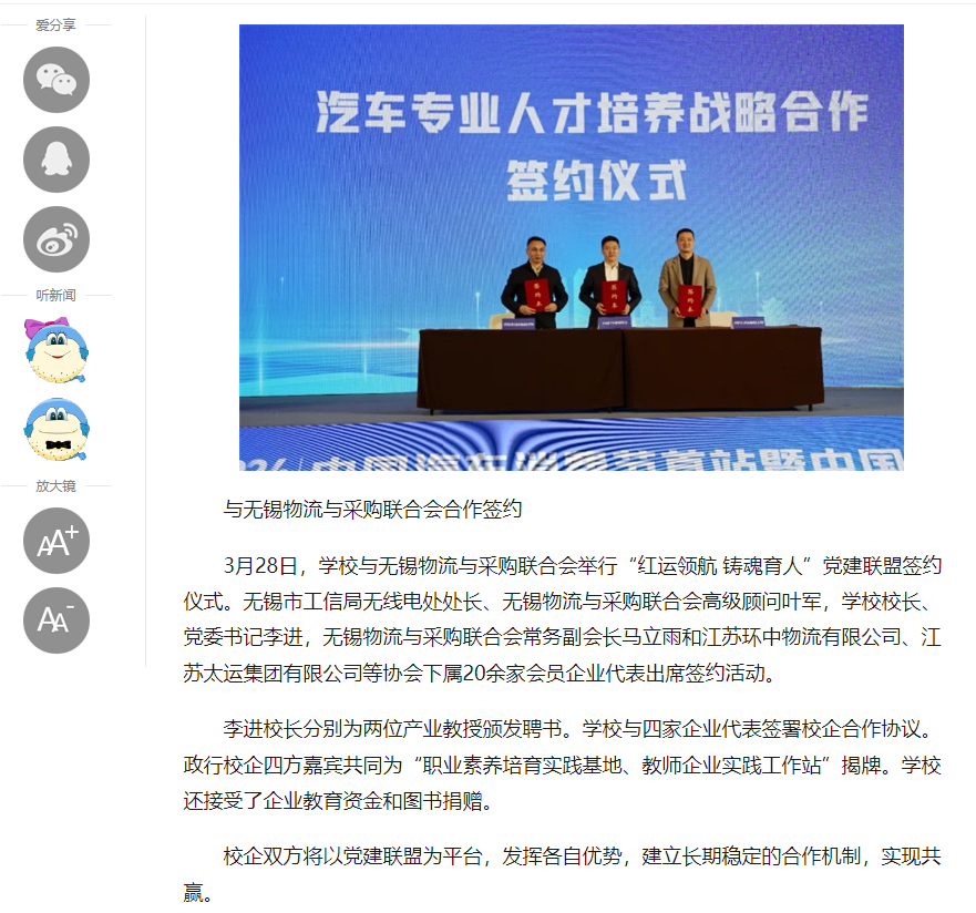 中江網(wǎng):江蘇省無(wú)錫交通高等職業(yè)技術(shù)學(xué)校物流管理學(xué)院黨總支同無(wú)錫物流與采購(gòu)聯(lián)合會(huì)黨支部舉行黨建聯(lián)盟簽約暨揭牌儀式