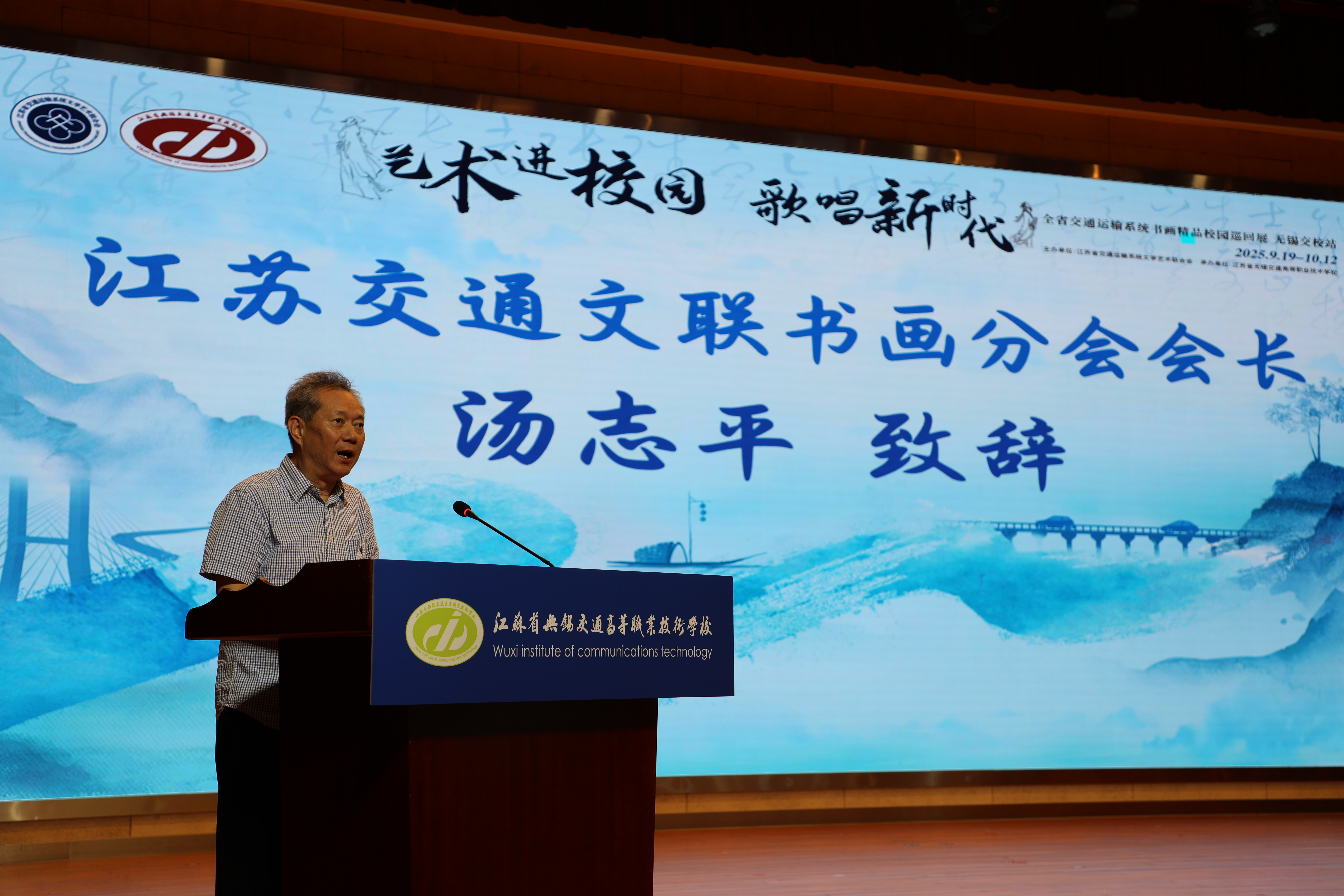 為深入學(xué)習(xí)習(xí)近平文化思想,推動文化育人與詩畫藝術(shù)深度融合,9月19日上午,“藝術(shù)進(jìn)校園·歌唱新時(shí)代”全省交通運(yùn)輸系統(tǒng)書畫精品校園巡回展走進(jìn)江蘇省無錫交通高等職業(yè)技術(shù)學(xué)校。江蘇省交通運(yùn)輸廳原黨組成員、副廳長、江蘇交通文聯(lián)會長金凌,省交通運(yùn)輸廳原二級巡視員、機(jī)關(guān)黨委書記,江蘇交通文聯(lián)副會長陳萍,省交通運(yùn)輸廳原二級巡視員、江蘇交通文聯(lián)副會長兼秘書長黃巖,江蘇交通文聯(lián)執(zhí)行秘書長、作家分會會長陸新民,江蘇交通文聯(lián)書畫分會會長湯志平,學(xué)校黨委書記李進(jìn)等領(lǐng)導(dǎo)出席活動。江蘇交通文聯(lián)相關(guān)負(fù)責(zé)同志、學(xué)校領(lǐng)導(dǎo)班子成員、各部門負(fù)責(zé)人以及師生代表參加活動并參觀書畫展?;顒佑蓪W(xué)校校長耿興華主持。