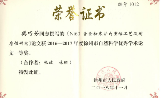2016-2017年度徐州市自然科學(xué)優(yōu)秀論文一等獎