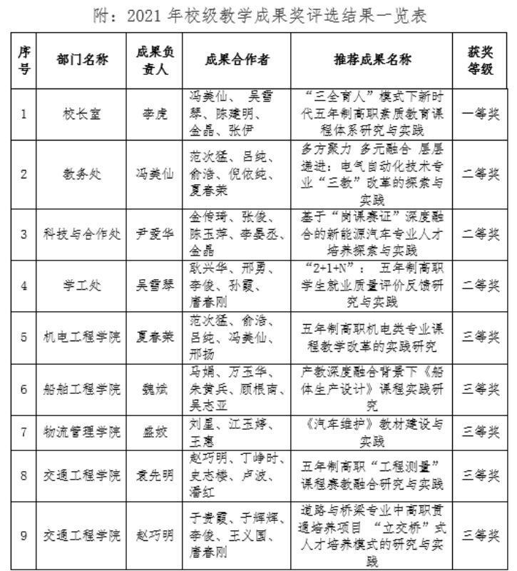 根據(jù)江蘇聯(lián)合職業(yè)技術(shù)學院《關(guān)于開展學院第八屆教學成果獎評選工作的通知》(蘇聯(lián)院研[2021]2號)和學?!蛾P(guān)于開展2021年度教學成果獎評選工作的通知》,學校認真組織開展了評審工作。在個人申報、院部遴選推薦的基礎(chǔ)上,根據(jù)學校《教學成果獎評選辦法》,組織教學工作委員會委員代表對申報材料進行了評審并經(jīng)校務(wù)會審定。評選出校級教學成果獎,一等獎1項,二等獎3項,三等獎5項,詳見附件。現(xiàn)將評選結(jié)果進行公示,并將獲一、二等獎的教學成果推薦參加江蘇聯(lián)合職業(yè)技術(shù)學院教學成果獎的評比,公示期為5月24日至5月30日,在公示期內(nèi)如對推薦結(jié)果有異議,請向教務(wù)處反映,電話68781132。