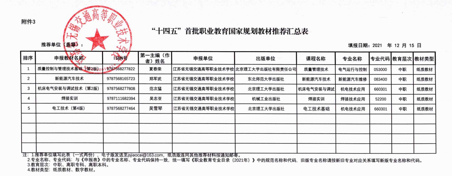 根據(jù)《省教育廳關(guān)于開展“十四五”首批職業(yè)教育國(guó)家規(guī)劃教材申報(bào)推薦工作的通知》學(xué)校擬推薦以下五本教材,現(xiàn)予以公示。