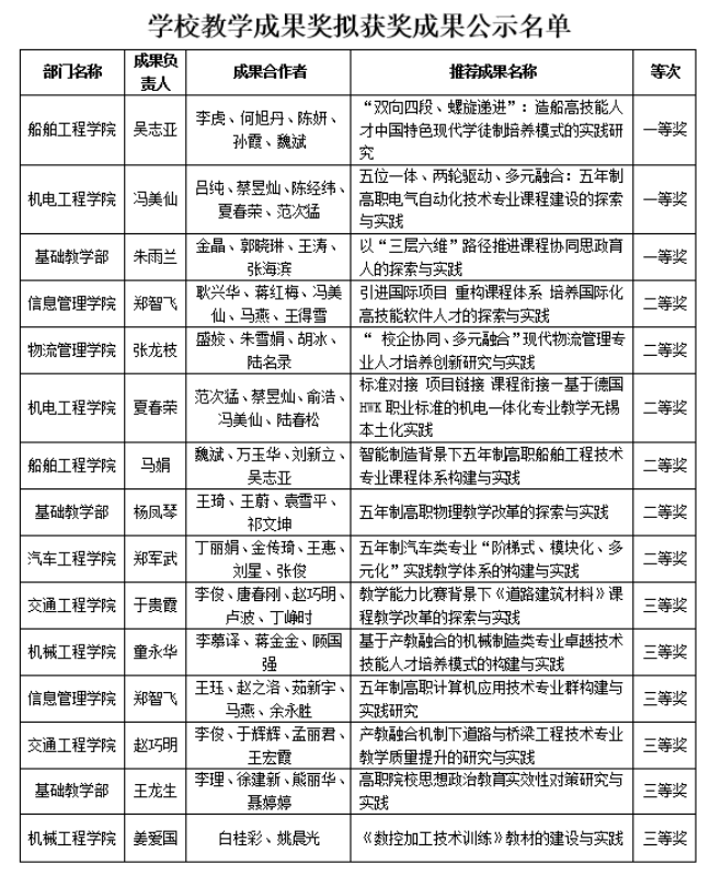 根據(jù)學(xué)校《關(guān)于開展2023年教學(xué)成果獎(jiǎng)評(píng)選工作的通知》,學(xué)校啟動(dòng)了2023年教學(xué)成果獎(jiǎng)的申報(bào)工作,共收到各部門的申報(bào)材料15份。經(jīng)教學(xué)工作委員會(huì)專家評(píng)審,校務(wù)會(huì)審議,《“雙向四段、螺旋遞進(jìn)”:造船高技能人才中國(guó)特色現(xiàn)代學(xué)徒制培養(yǎng)模式的實(shí)踐研究》等3項(xiàng)為校級(jí)一等獎(jiǎng),《引進(jìn)國(guó)際項(xiàng)目,重構(gòu)課程體系——培養(yǎng)國(guó)際化高技能軟件人才的探索與實(shí)踐》等6項(xiàng)為校級(jí)二等獎(jiǎng),《教學(xué)能力比賽背景下《道路建筑材料》課程教學(xué)改革的探索與實(shí)踐》等6項(xiàng)為校級(jí)三等獎(jiǎng),現(xiàn)予以公示。