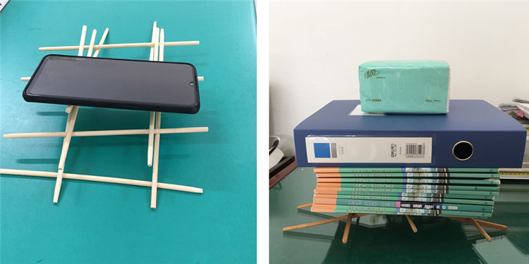 用筷子搭建橋梁,不僅是進(jìn)行簡單的搭建,更重要的是構(gòu)思如何搭建足夠結(jié)實(shí)的橋梁。活動(dòng)結(jié)束后,師生分享活動(dòng)心得,總結(jié)筷子間摩擦力的大小、筷子的形狀、桌面的摩擦力大小等影響搭建質(zhì)量的因素。