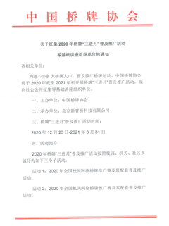 為進(jìn)一步擴(kuò)大橋牌人口,普及推廣橋牌運(yùn)動(dòng),中國(guó)橋牌協(xié)會(huì)組織開(kāi)展了橋牌進(jìn)校園、進(jìn)機(jī)關(guān)、進(jìn)社區(qū)的橋牌“三進(jìn)月”普及推廣活動(dòng),我校成功入選全國(guó)校園網(wǎng)絡(luò)橋牌推廣活動(dòng)組織單位。