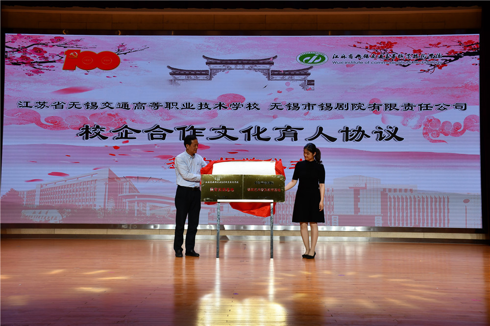 開幕式上,耿興華副校長和無錫市錫劇院徐俊副院長簽訂學(xué)校與無錫市錫劇院開展“錫劇文化進校園”校企合作協(xié)議并揭牌。為學(xué)校增掛“錫劇藝術(shù)普及教育基地”、 同時為戲劇院增掛“美育實踐基地”。此舉通過打造地方戲劇文化學(xué)習(xí)宣傳普及基地,弘揚錫劇藝術(shù),傳承優(yōu)秀地方文化,也進一步加強學(xué)校美育工作。