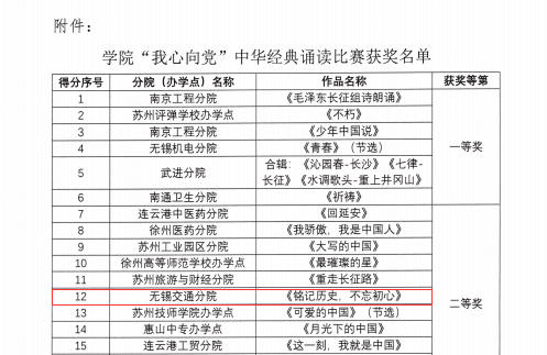 為弘揚中華優(yōu)秀語言文化,歌頌建黨百年光輝歷程,彰顯舉世矚目偉大成就,增強愛黨愛國情懷。江蘇聯(lián)合職業(yè)技術學院開展了“我心向黨”中華經(jīng)典誦讀比賽活動,根據(jù)《關于公布學院“我心向黨”中華經(jīng)典誦讀比賽獲獎名單通知》,我校節(jié)目《銘記歷史 不忘初心》榮獲二等獎。