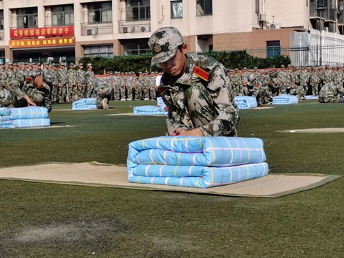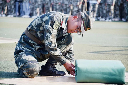 經(jīng)過幾天緊張的模擬訓(xùn)練,學(xué)生們都躍躍欲試,摩拳擦掌,一展風(fēng)采。100名新生有序地來到操場,進(jìn)行一場疊被子技能大比拼,伴隨著口令,他們立即進(jìn)入狀態(tài),迅速蹲下,鋪平、壓實(shí)、翻折、摳角、捏線,熟練地疊起被子,有的還以尺子予以輔助。