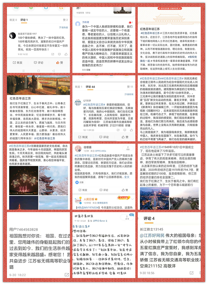 我在祖國懷里成長,我為祖國祝福。以網(wǎng)為媒,學(xué)生參與江蘇自媒體聯(lián)盟在微博等網(wǎng)絡(luò)平臺開設(shè)的“紅色百年話江蘇”話題活動,把對偉大祖國的熱愛和祝福在互聯(lián)網(wǎng)上高高飄揚(yáng)。