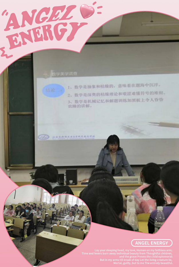 通過此次活動,同學們了解了數(shù)學美的各種形態(tài),包括文化藝術(shù)美、對稱美、簡潔美、和諧美、奇異美、突變美、創(chuàng)新美、發(fā)展美等,真正地走近數(shù)學,進一步激發(fā)了學生對數(shù)學的熱情,吸引更多的學生投入到對數(shù)學之美的探索中。
