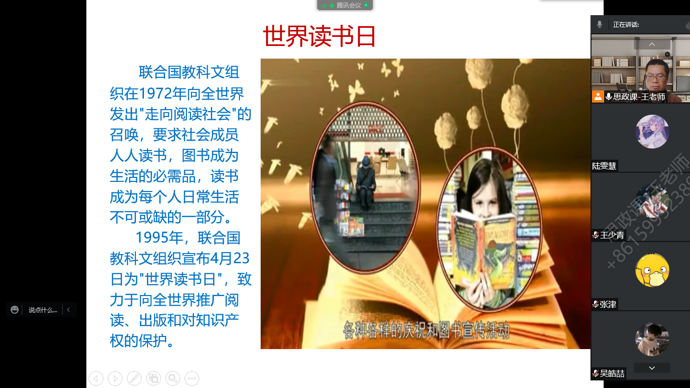 最后,王老師在線上與社團(tuán)成員一起交流了讀書(shū)的方法與心得,并且希望社團(tuán)成員們能夠趁年輕時(shí)多讀書(shū)、讀好書(shū),養(yǎng)成愛(ài)讀書(shū)的好習(xí)慣,不僅在“世界讀書(shū)日”要讀書(shū),而且應(yīng)該把讀書(shū)的好習(xí)慣融入到生活中的每一天!