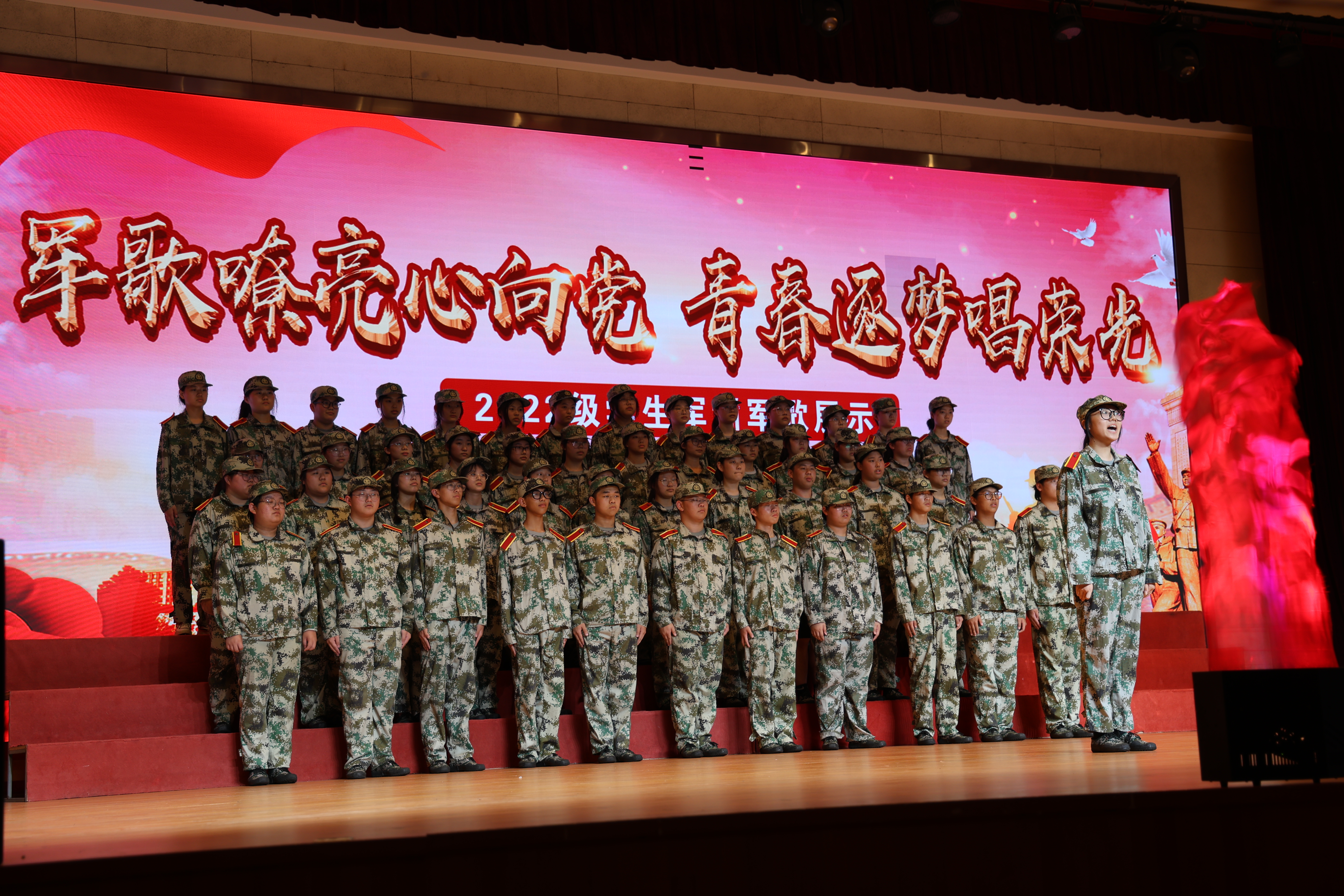 伴隨著高亢激昂的旋律,軍歌展示在全體觀眾的掌聲和熒光中拉開帷幕。《強軍戰(zhàn)歌》《當(dāng)那一天來臨》《軍中綠花》《當(dāng)祖國召喚的時候》《人民軍隊忠于黨》等充分展現(xiàn)了當(dāng)代學(xué)子的自強與擔(dān)當(dāng),新征程的號角早已吹響,腳下的路即將寫滿鐵血榮光;《我和我的祖國》《紅旗飄飄》《我愛你中國》《我的中國心》等唱出了作為一個中國人的榮光,一個中國人的自豪;《少年》《跟我上》《把青春壓進(jìn)槍膛》等展現(xiàn)出同學(xué)們懷著滿腔的熱血與理想,堅持不懈,永不言棄,用青春與汗水譜寫出青春之歌;《走向復(fù)興》《我們走在大路上》等唱出了我們迎著初升的太陽,走在嶄新的道路上,與祖國一起走向復(fù)興,創(chuàng)造輝煌的美好愿景......各連的歌聲氣勢磅礴、鏗鏘有力、富有激情,氣勢振奮人心。同學(xué)們以曲抒情,用歌言志,訴說者對祖國的忠誠和熱愛,表達(dá)著為祖國奮斗的決心意志。