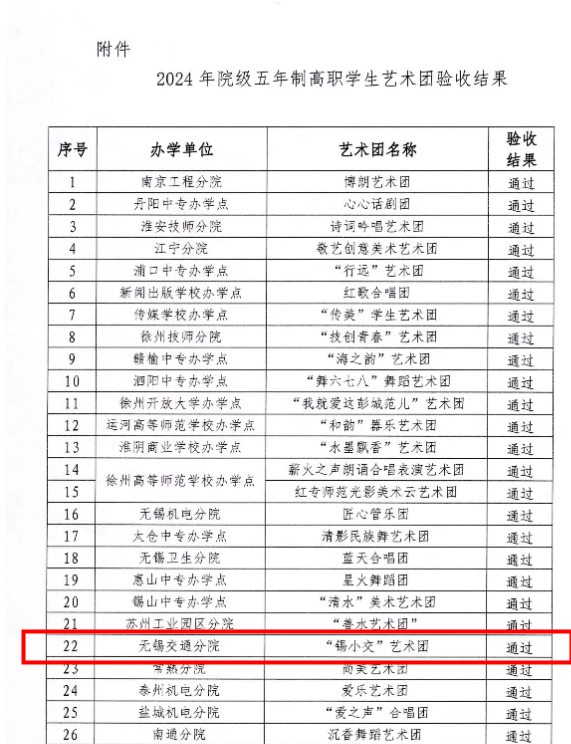 根據(jù)《關(guān)于開展2024年院級五年制高職學(xué)生藝術(shù)團(tuán)驗收工作的通知》要求,經(jīng)組織專家查看材料、聽取匯報和現(xiàn)場答辯等綜合評定,我?!板a小交”藝術(shù)團(tuán)順利通過江蘇聯(lián)合職業(yè)技術(shù)學(xué)院五年制高職學(xué)生藝術(shù)團(tuán)評審驗收。