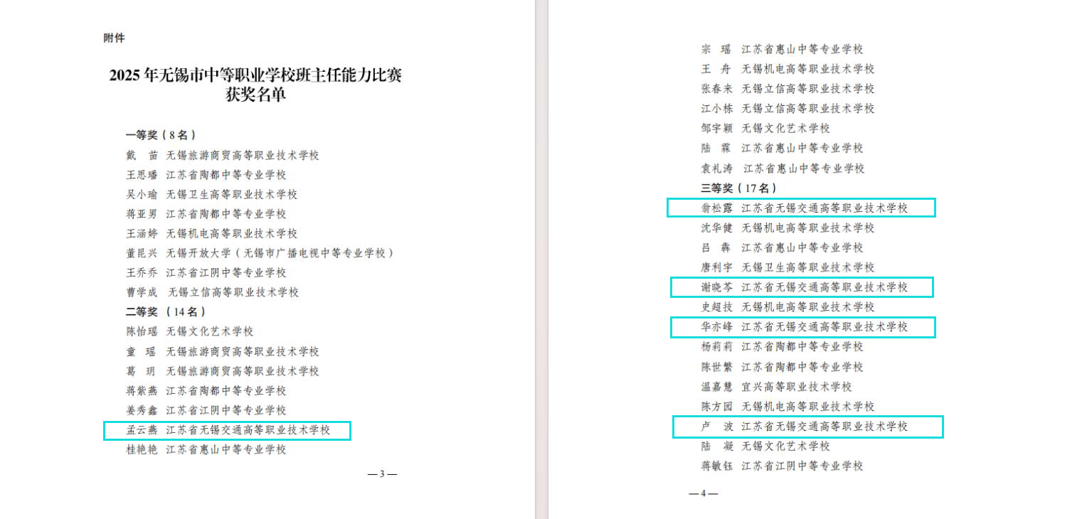 在剛剛落幕的2025年無(wú)錫市中等職業(yè)學(xué)校班主任能力比賽中,經(jīng)過(guò)激烈角逐,學(xué)校參賽教師表現(xiàn)優(yōu)異,5名教師全部獲獎(jiǎng),其中1名教師獲得二等獎(jiǎng),4名教師獲得三等獎(jiǎng)。展現(xiàn)了學(xué)校班主任隊(duì)伍過(guò)硬的專業(yè)素養(yǎng)和育人水平,為學(xué)校贏得了榮譽(yù)。