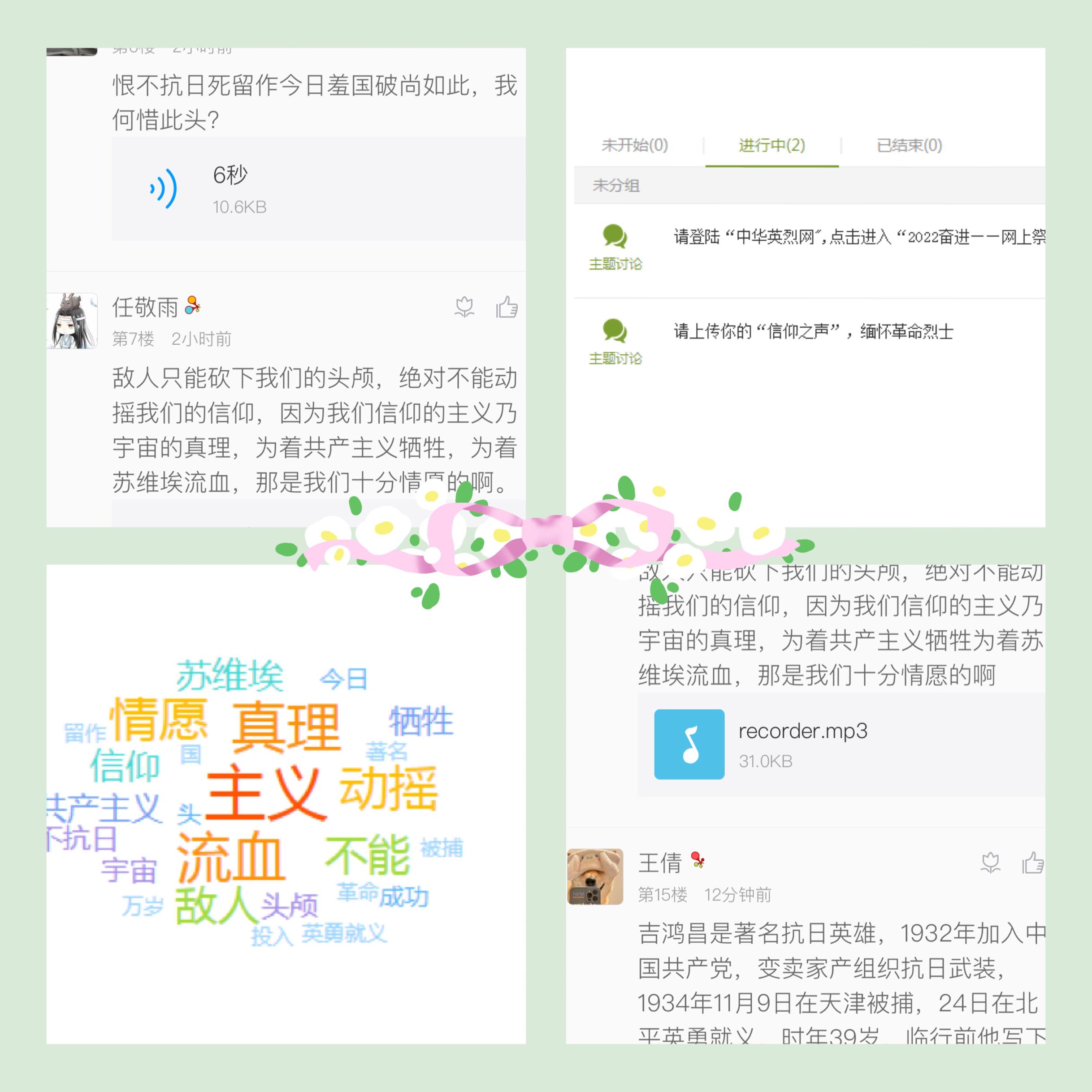 本次社團(tuán)活動(dòng)根據(jù)疫情防控要求,利用學(xué)習(xí)通平臺(tái)進(jìn)行線上活動(dòng)。活動(dòng)中,茶藝社兩位社團(tuán)指導(dǎo)老師通過(guò)學(xué)習(xí)通直播平臺(tái),與同學(xué)們一起了解清明節(jié)的由來(lái)以及傳統(tǒng)習(xí)俗,介紹了中國(guó)共產(chǎn)黨在百年奮進(jìn)史中涌現(xiàn)出的革命先烈以及先進(jìn)事跡。為表達(dá)對(duì)革命先烈的緬懷之情,同學(xué)們紛紛錄制了語(yǔ)音朗誦音頻并上傳至學(xué)習(xí)通。